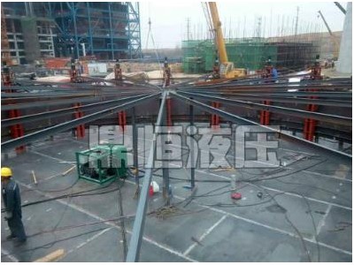 液压提升设备是一种新颖的起重设备,是集机械、液压、电气自动控制一体化的设备。主要由提供液压油的液压泵站和执行提升的液压千斤顶、提升支承体系、钢内筒吊装吊点、承载预应力钢绞线及卡紧机构、上下锚头等组成。